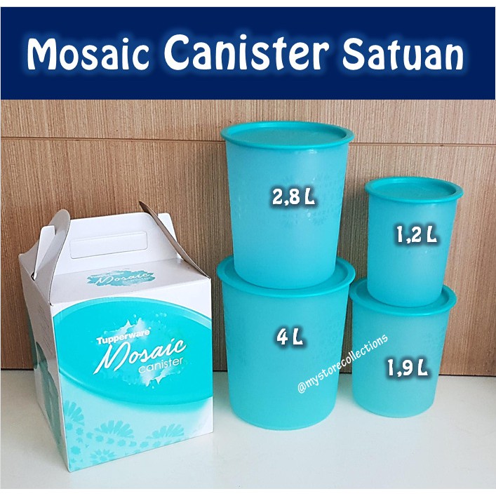 Mosaic Canister SatuanUkuran :a. Small Mosaic Canister (2)1.2 L / d:12.8 cm; t:15.5 cm1.9 L /d:14.8 cm; t.17.4 cmb. Medium Mosaic Canister2.8 L / d:17 cm; t:18.8 cmc. Large Mosaic Canister4 L/ d:19 cm; t:21.2 cmAgar snack favorit Anda tetap terjaga kelezatan dan kerenyahannya, Anda perlu wadah yang ketat udara seperti Mosaic Canister . Selain memiliki desain dan warna baru yang cantik, Mosaic Canister memungkinkan Anda menyimpan berbagai jenis snack arena memiliki berbagai ukuran yang bisa disesuaikan dengan jenis dan ukuran camilan Anda.Berikut fitur dan keistimewaan Mosaic Canister :1.Memiliki one touch seal yang memudahkan untuk menutupnya, yaitu dengan cara ditekan satu kali dengan sikut atau jari di bagian tengah seal.2.Dengan warna turqoise yang elegan dan mewah serta motif mosaic pada base menambah cantik wadah penyimpanan snack Anda, senada dengan koleksi serving terbaru pada meja Anda.3.Seal ketat udara, sehingga menjaga kerenyahan makanan lebih tahan lama.4.Produk ini dapat disimpan secara nesting, sehingga menghemat tempat penyimpanan saat tak dipakai.5.Mosaic Canister Set dapat disimpan secara stackable (bertumpuk) dan tidak jatuh, sehingga hemat tempat.Sebagai inspirasi, Anda dapat menggunakan Mosaic Canister Set untuk wadah menyimpan aneka keripik atau kue kering yang tentu membutuhkan ketetatan udara sempurna agar tetap renyah. Selain itu, Anda juga dapat menggunakan tutup Large Mosaic Canister sebagai alas snack.NB : MOHON TANYAKAN KETERSEDIAAN BARANG TERLEBIH DA