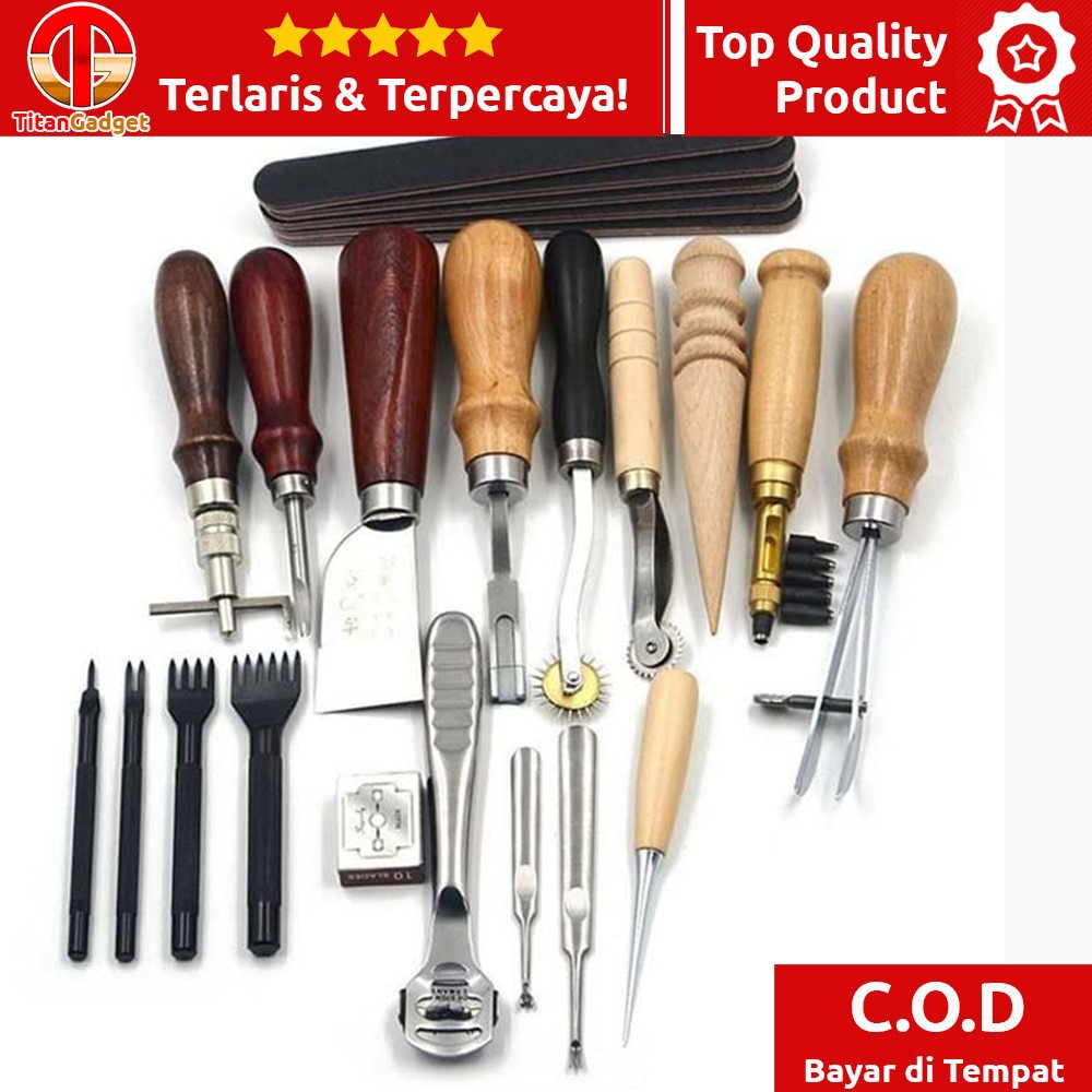 **** KLAIM BARANG/PART KURANG /RETUR WAJIB MENYERTAKAN VIDEO UNBOXING, TANPA VIDEO UNBOXING GARANSI HANGUS ****===============================================Peralatan Seni DIY Kulit 18in1 Leather Craft Stitching Tool Set WA134 TItanGadget- Pilihan produk: Multi Warna- Berat: 1.3kg- Garansi: idak ada garansi untuk produk ini.- MaterialStainless Steel + Wood- Proses Retur dan Klaim Garansi sesuai prosedur di toko Kami ^^- SKU Toko: 7ROT1LXXPackage ContentsBarang-barang yang anda dapat dalam kotak produk:5 x Leather Edge Grinding Polish Tool1 x Adjustable Leather Edge Stitching Groover Tool1 x Wood Handle Edge Beveler 1mm1 x Japanese Style Skiving Knife1 x Leather Edge Edger Beveler Skiving Tool1 x Leather-craft Sewing Roulette Leather Stitching Wheel 2.5mm1 x Leather-craft Sewing Roulette Leather Stitching Wheel 4mm1 x Wood Multi-Size Edge Slicker1 x Multi-Size Hole Punch, 1.5mm/2mm/2.5mm/3mm/3.5mm/4mm1 x Adjustable Edge Creaser up to 1.5cm1Set Leather Stitching Diamond Chisel 4mm 1,2,4,6 Prong1 x Skiving Tool with 5pcs Replacement Blades1 x Stainless Edge Beveler 1mm1 x Stainless Edge Beveler 2mm1 x Wood handle AwlSpesifikasi Peralatan Seni DIY Kulit 18in1 Leather Craft Stitching Tool Set WA134MaterialStainless Steel + WoodInformasi Produk Peralatan Seni DIY Kulit 18in1 Leather Craft Stitching Tool Set WA134Alat ini sangat berguna bagi Anda pengrajin atau crafter dengan bahan kulit. Semua peralatan ini membantu Anda dalam berbagai pekerjaan seperti memotong kulit, mengukir kulit, menjahit kulit dan lainnya. Wajib dimiliki untuk Anda yang ingin belajar leather craft atau bahkan untuk para profesional pengrajin kulit.FeaturesLeather Crafter Must HaveAlat ini wajib dimiliki bagi para pengrajin berbahan dasar kulit. Sangat cocok digunakan untuk membuat tas kulit, dompet kulit, sleeve laptop kulit dan lainnya.18 in 1Semua peralatan yang dibutuhkan untuk leather craft tersedia dalam product ini. 18 tools ini sangat membantu dalam pekerjaan leather crafting.High Quality MaterialSetiap peralatan leather craft ini terbuat dari material terbaik mulai dari besi stainless steel hingga gagang kayu berkuali