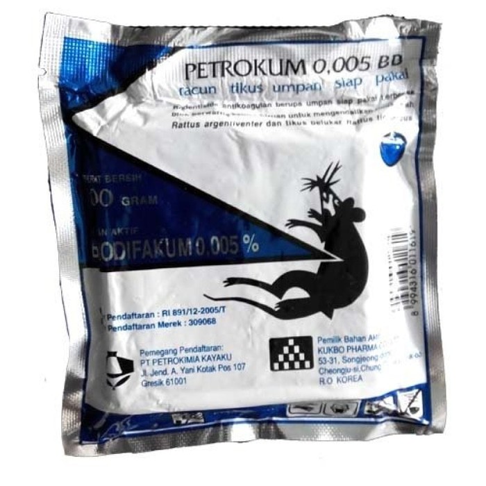 Petrokum 0,005 BB adalah Rodentisida (racun tikus) antikoagulan berbentuk umpan padatan (wax block) segi empat berwarna hijau kebiru-biruan berisi butiran b