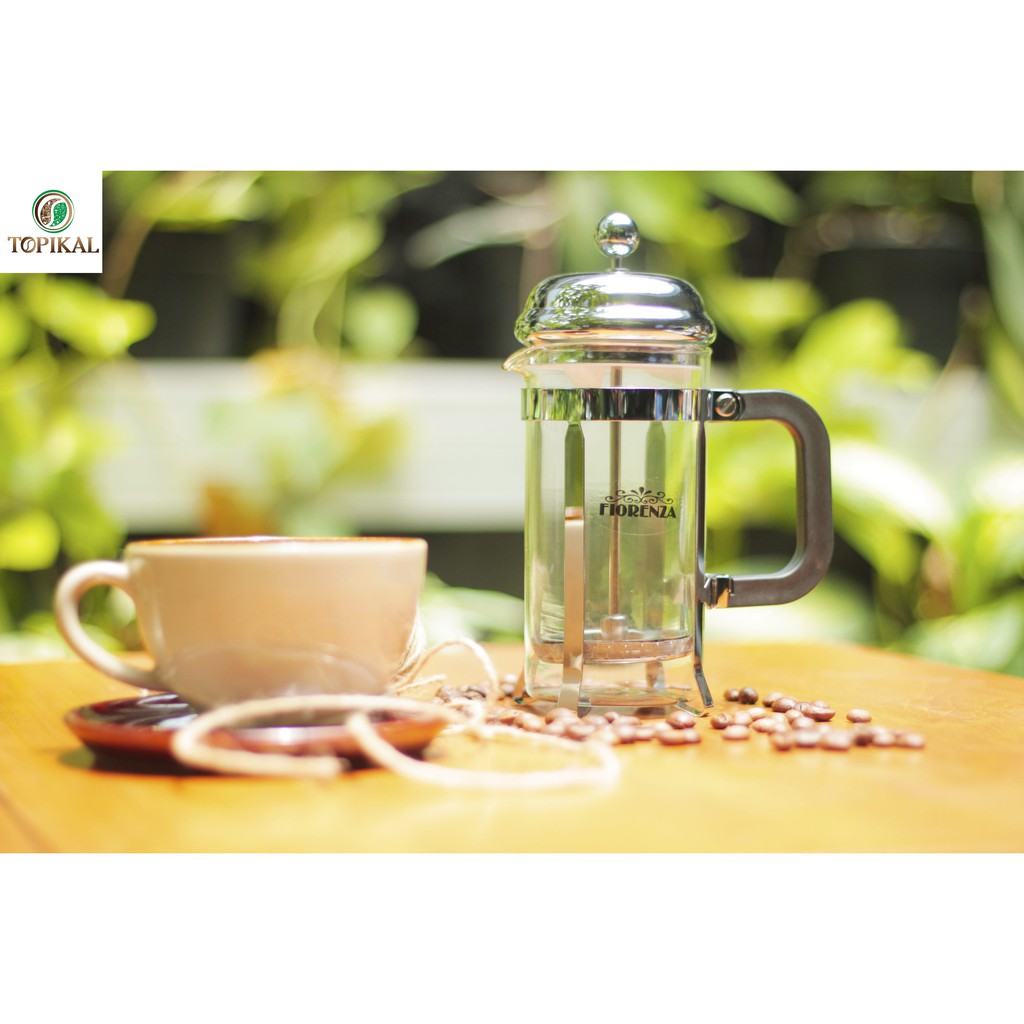 Kelebihan Produk: 1. Ampas kopi tidak masuk kedalam gelas. 2. Kapasitas air kopi yang banyak sehingga bisa dibagi ke tiga gelasBahan: Stainless Steel dan Kaca TransparanUkuran Kardus: P 12,5 cm x L 8,5 cm x T 19 cmUkuran Produk: T 18 cmCara Pemakaian: 1. Masukkan 20 gram kopi bubuk giling kasar ke gelas french press. 2. Tuangkan 350ml air panas suhu 88-92c langsung mengenai kopi. 3. Taruh penekan diatas gelas, tunggu sampai 4 menit, lalu ditekan ke bawah.Perhatian Pemakaian: 1. Tidak untuk dimasak di atas api. 2. Jangan bertumbukkan dengan benda keras untuk menghindari pecah. 3. Saat membersihkan jangan pakai sikat logam atau kain yang korosif agar tidak mudah retak atau pecah. 4. hindari dari jangkauan anak-
